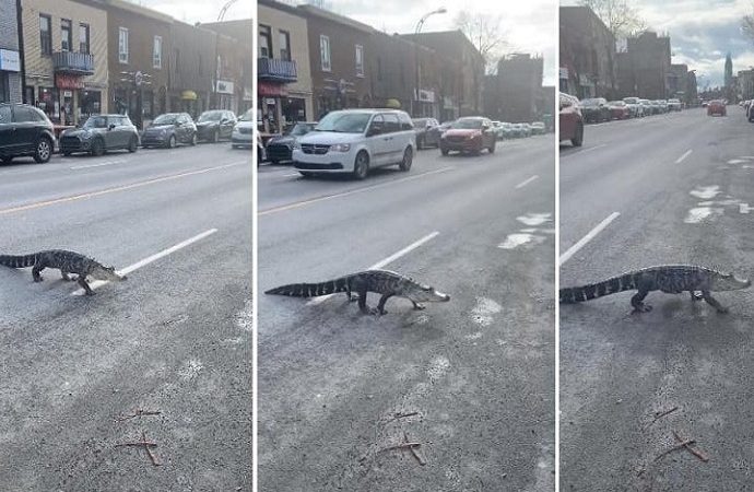 மொன்றியால் நகரில் விலங்குகளை காட்சிப்படுத்தும் தனியார் நிறுவனத்தின் வாகனத்தில் இருந்து தப்பித்த முதலை ஒன்று வீதியை கடந்துள்ளது.
