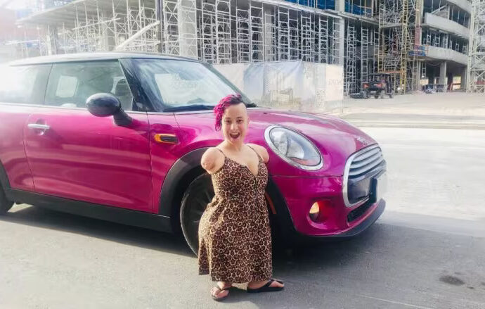 இரண்டு கைகளும் இல்லாத கால்களின் உயரமும் குறைந்த இந்த பெண்ணுக்கு செலுத்தக்கூடிய வகையிலான வாகனம் ஒன்றை விசேடமாக வடிவமைக்க வேண்டி இருந்தது.