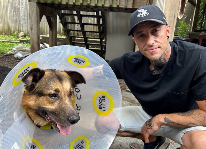 தனது நாயை கத்தியால் குத்த முயற்சித்த போது அதனை தடுப்பதற்கு முயன்ற சந்தர்ப்பத்தில் இரண்டு தடவைகள் கத்திக்குத்திக்கு இலக்கானதாக அவர் தெரிவிக்கின்றார்.