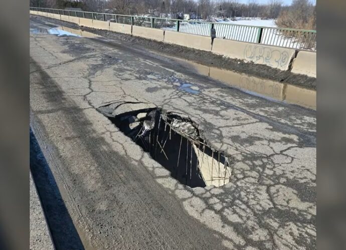 மேலும் அவர் சமூக ஊடகங்களில் பகிர்ந்த புகைப்படங்களில் பாலத்தின் ஒரு வழித்தடத்தின் நடுப்பகுதியில் பெரிய துளையும் வெளிப்பட்ட இரும்புக் கம்பிகளும் காணப்பட்டன. இந்த பாலம் Châteauguay River ஆற்றை கடந்து செல்கிறது என்பது குறிப்பிடத்தக்கது.