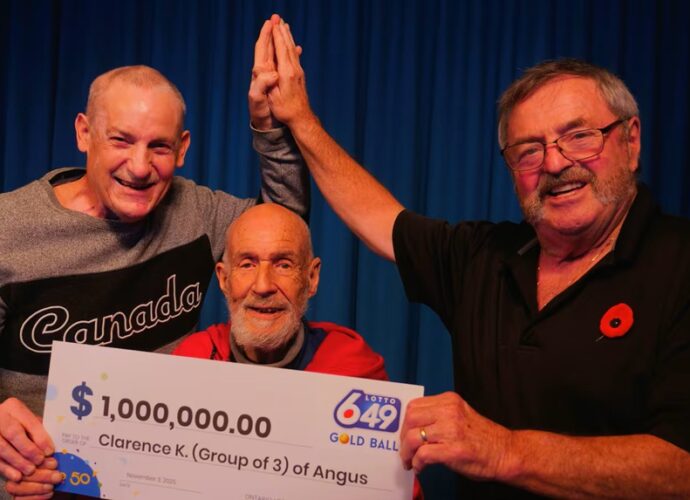 கனடாவில் ஓய்வு பெற்ற மூன்று முதியவர்கள் லொத்தர் சீட்டிலுப்பில் பரிசு வென்றுள்ளனர். ஓய்வுபெற்ற மூன்று நண்பர்கள்—கிளாரன்ஸ் கென்னடி (Angus), கென்னத் மா (Kenneth Maw) மற்றும் கர்ட் லாவ்லர் (Kurt Lawler) (Barrie)—2025 ஜூலை 16ஆம் திகதி நடைபெற்ற லொட்டோ 6/49 சீட்டிலுப்பில் 1 மில்லியன் டாலர் பரிசை வென்றுள்ளனர்.