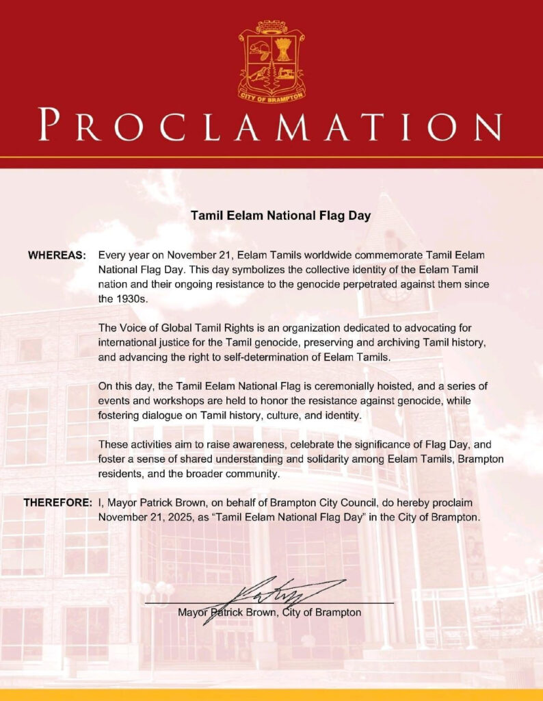 நகர முதல்வர் Patrick Brown இப்பிரகடனத்தை இன்று (November 19, 2025) Brampton மாநகர மேயர் பற்றிக் பிரவுண்(Patrick Walter Brown) உத்தியோகபூர்வமாக வெளியிட்டு வைத்தார்