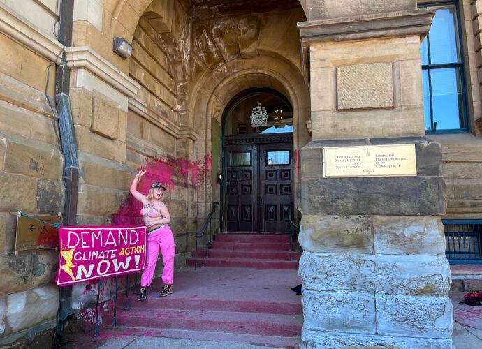 இந்நிலையில், Ever என்னும் பெயரில் அறியப்படும் Casey Hatherly என்னும் அந்த பருவநிலை ஆர்வலர், கனேடிய பிரதமர் ஜஸ்டின் ட்ரூடோவின் அலுவலகத்தின் மீது ஒரு பக்கெட் இளஞ்சிவப்பு நிற பெயிண்டை வீசும் காட்சிகள் வெளியாகியுள்ளன.