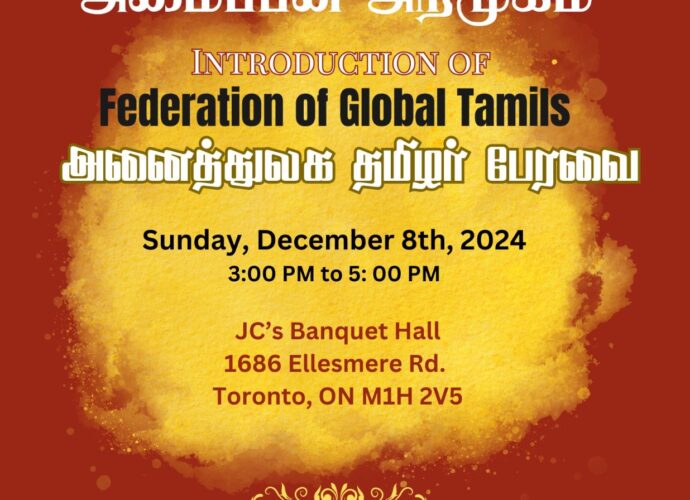 Reading Time: < 1 minuteஅனைத்துலக தமிழர் பேரவை (Federation of Global Tamils) என்ற அமைப்பு கனடாவில் அறிமுகமாகவுள்ளது. இதன் அறிமுக நிகழ்வு எதிர்வரும் டிசம்பர் 8ஆம் திகதி கனடாவில் ‘1686 Ellesmere Rd. Toronto. ON MIH 2V5’ எனும் முகவரியில் ‘JC’s BanQuet Hall’ என்ற மண்டபத்தில் பிற்பகல் 3மணி முதல் 5 மணிவரை இடம்பெறவுள்ளது. Tamil Business Directory Real Estate Mortgage & Loans Lawyers Accounting &Read More →