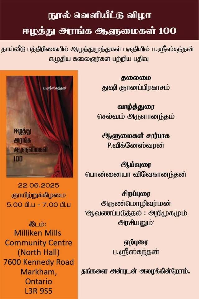 If you have an event you’d like us to post, a suggestion on how we can make our calendar better, or any other question, please email us at info(at)torontotamil.com. You can also complete our online event submission form. We look forward to hearing from you!