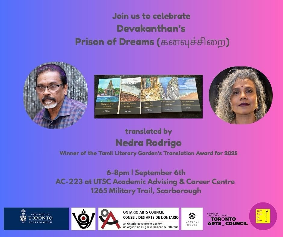 We warmly invite you to a celebration of Devakanthan’s sweeping quintet ‘Prison of Dreams,’ (கனவுச்சிறை/Kanavuchirai) translated by Nedra Rodrigo.