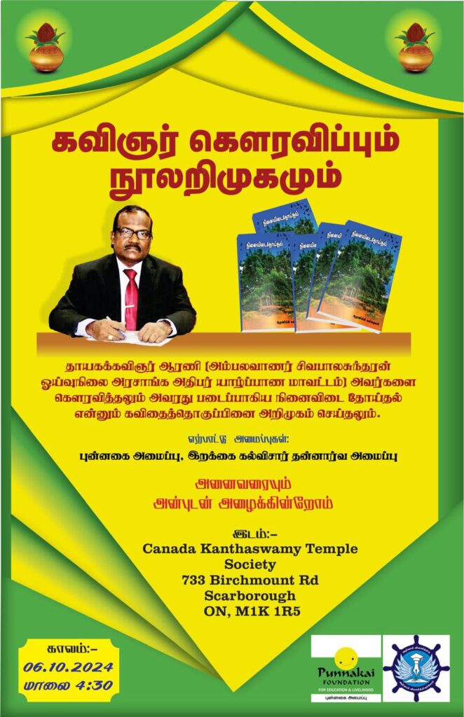 தாயக கவிஞர் ஆரணி எனும் புனைப்பெயருடைய இளைப்பாறிய யாழ் அரசாங்க அதிபரும் வட மாகாணசபையின் விவசாய அமைச்சு, பொதுச்சேவை ஆணைக்குளு ஆகியவற்றின் செயலாளராகவும் பிரதிப்பிரதம செயலாளராகவும் கடமை ஆற்றியதுடன் அரச கருமமொழிகள் ஆணைக்குழுவின் உறுப்பினராகவும் கடமையாற்றும் மதிப்புக்குரிய அ. சிவபாலசுந்தரன் அவர்களின் கௌரவிப்பும் நூலறிமுகநிகழ்வும் கனடா கந்தசுவாமி கோவில் மண்டபத்தில் நடாத்த ஏற்பாடு செய்யப்பட்டுள்ளது