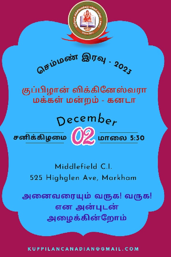 If you have an event you’d like us to post, a suggestion on how we can make our calendar better, or any other question, please email us at info(at)torontotamil.com. You can also complete our online event submission form. We look forward to hearing from you!