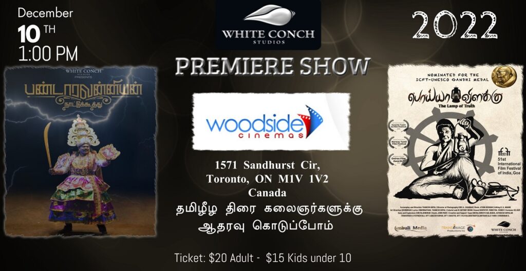 வெண்சங்கு கலைக்கூடத்தின் இரண்டாவது படைப்பாக அருகி வரும் ஈழத்து கலையான பண்டாரவன்னியன் கூத்து திரை காணொளி வடிவில் December 10, 2022 அன்று பி.ப 1 மணிக்கு Woodside திரை அரங்கில் காண்பிக்க படவுள்ளது. இதன் பின்னர் நேரம் சுருக்கப்பட்ட பொய்யா விளக்கு திரைப்படமும் காண்பிக்க படும். நுழைவு சீட்டு $20 (சிறுவர்களுக்கு $15) திரை அரங்கில் பெறலாம்.