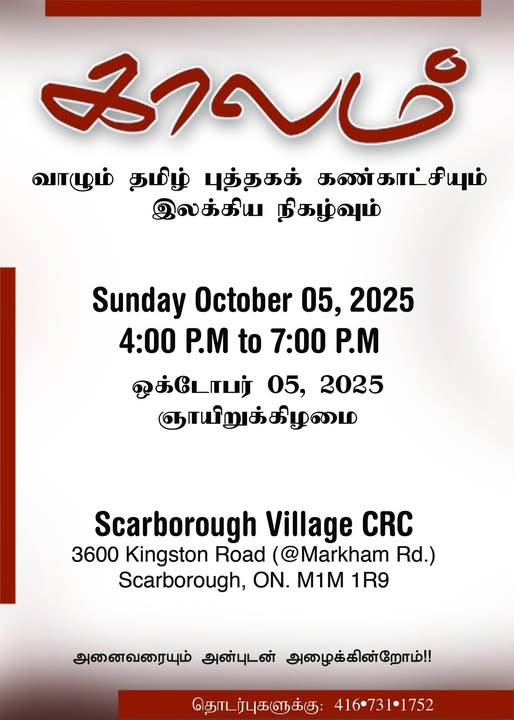 If you have an event you’d like us to post, a suggestion on how we can make our calendar better, or any other question, please email us at info(at)torontotamil.com. You can also complete our online event submission form. We look forward to hearing from you!
