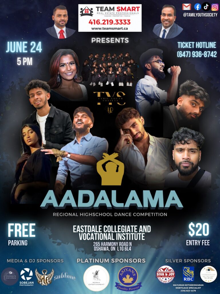 Behalf of Tamil Youth Society, we invite you to Aadalama 2023, happening on Saturday, June 24th, at Eastdale Collegiate and Vocational Institute (265 Harmony Drive N, Oshawa ON, L1G 6L4) at 5 pm/17:00.