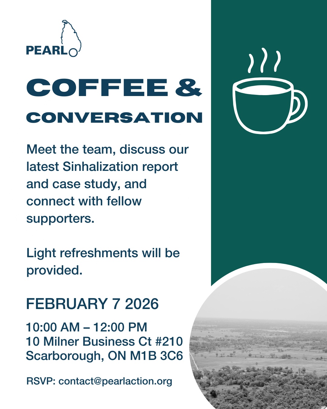 Coffee and Conversation. opportunity for folks to meet the team and learn about our newest Sinhalization report. RSVP link is here.