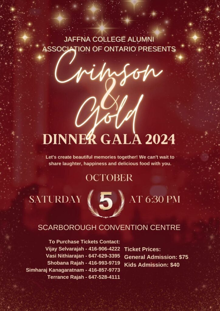 Jaffna College Alumni Association of Ontario presents Crimson & Gold Dinner Gala 2024