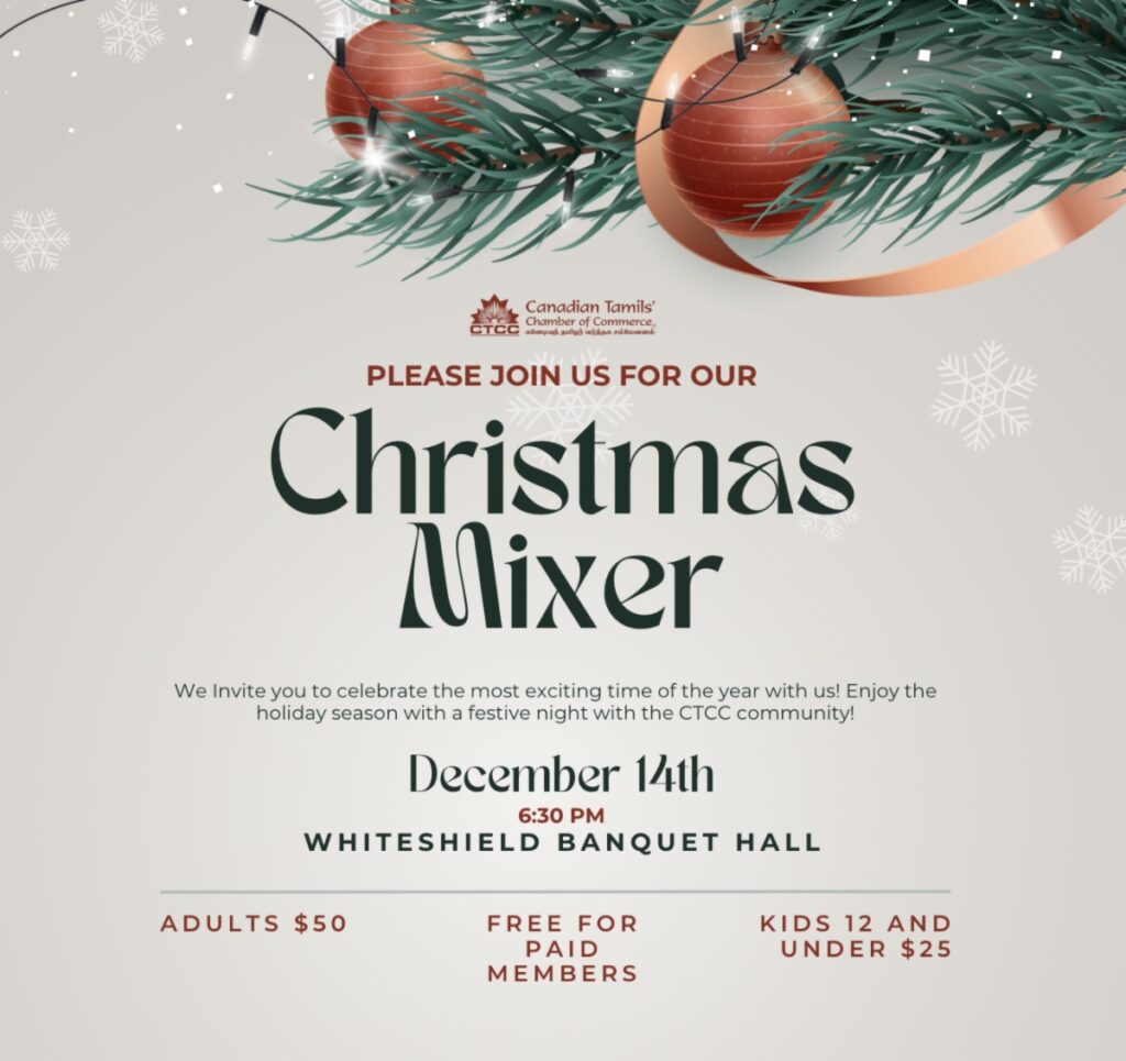 The holidays are getting closer, and the Canadian Tamils’ Chamber of Commerce is hosting a Christmas mixer! Join us as we will celebrate the season with festive dancing and dinner!
