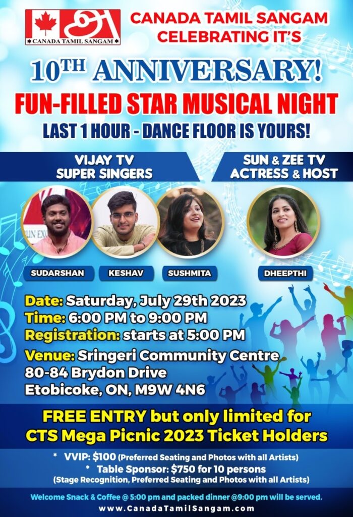 If you have an event you’d like us to post, a suggestion on how we can make our calendar better, or any other question, please email us at info(at)torontotamil.com. You can also complete our online event submission form. We look forward to hearing from you!