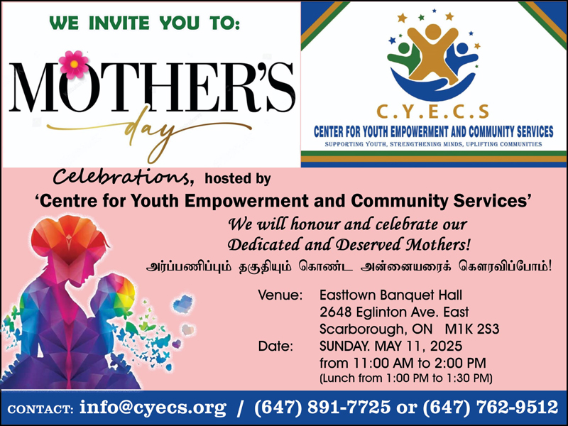 கனடா ஸ்காபுறோ நகரில் Youth Empowerment and Community Service அமைப்பினர் நடத்தும் அன்னையர் தின விழா