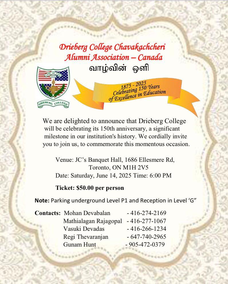 Drieberg College Chavakachcheri Alumni Canada – 150th Anniversary