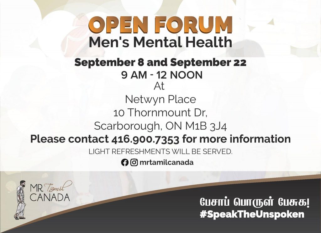 An open forum to discuss topics relating to mental healthcare, challenges that Tamil men face & recent incidents that have occurred within our community.