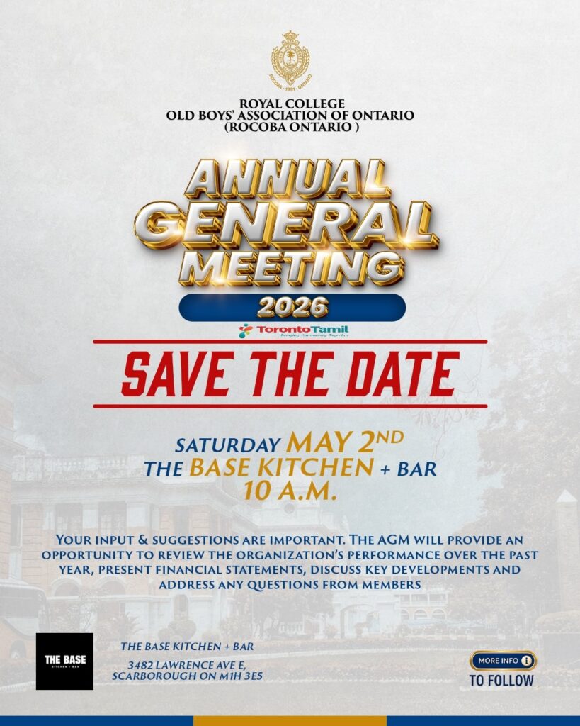 The Royal College Old Boys’ Association of Ontario Annual General Meeting 2026 is set for Saturday, May 2nd at 10 a.m. at The Base Kitchen + Bar, Scarborough.