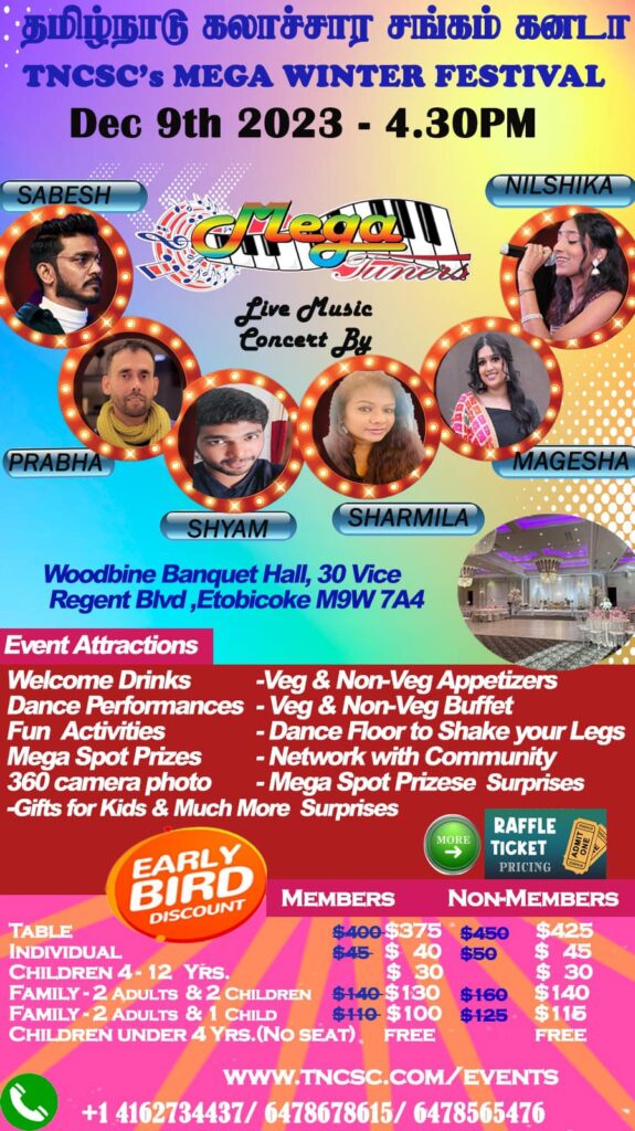 Tamil Nadu Cultural Association TNCSC is organizing a MEGA Winter Festival to celebrate the festival’s season with various art and live music concert on December 9th 2023, in a Splendid and Spacious Banquet Hall.