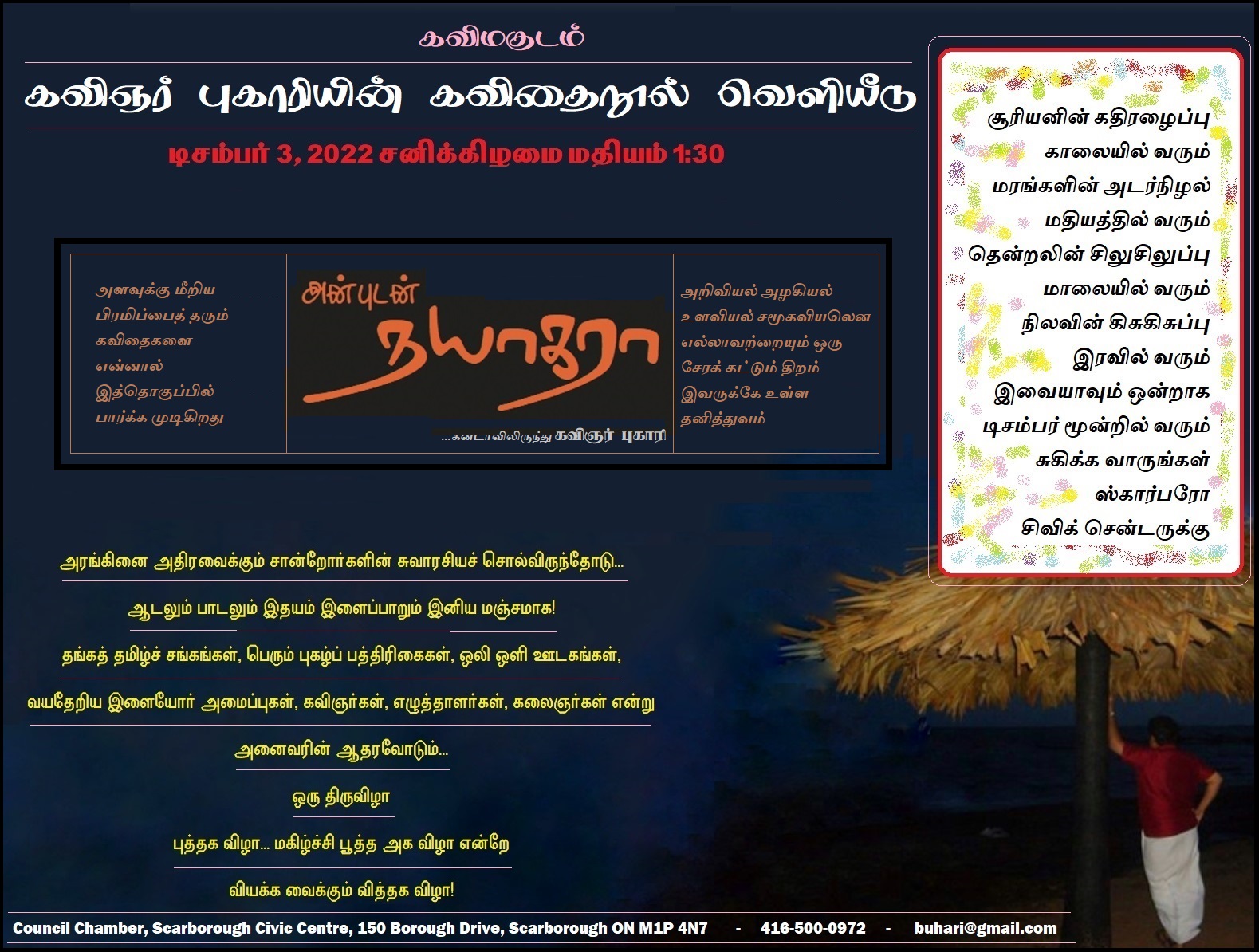 கவிஞர் புகாரியின் கவிதை நூல் வெளியீடு. Kavingar BUHARI BOOK RELEASE FUNCTION Dec 3, 2022 1:30pm AGENDA 1. Starts with homemade Tamilnadu special Sweet Kaaram Kaappi 2. Precise Speeches3. Exciting Parai4. Ladies Dance பொன்னிநதி 5. Teen Dance அழகே அழகே VENUE Council Chamber, Scarborough Civic Centre150 Borough Dr, Scarborough, ON M1P 4N7Map +Code: QPFR+5W My golden