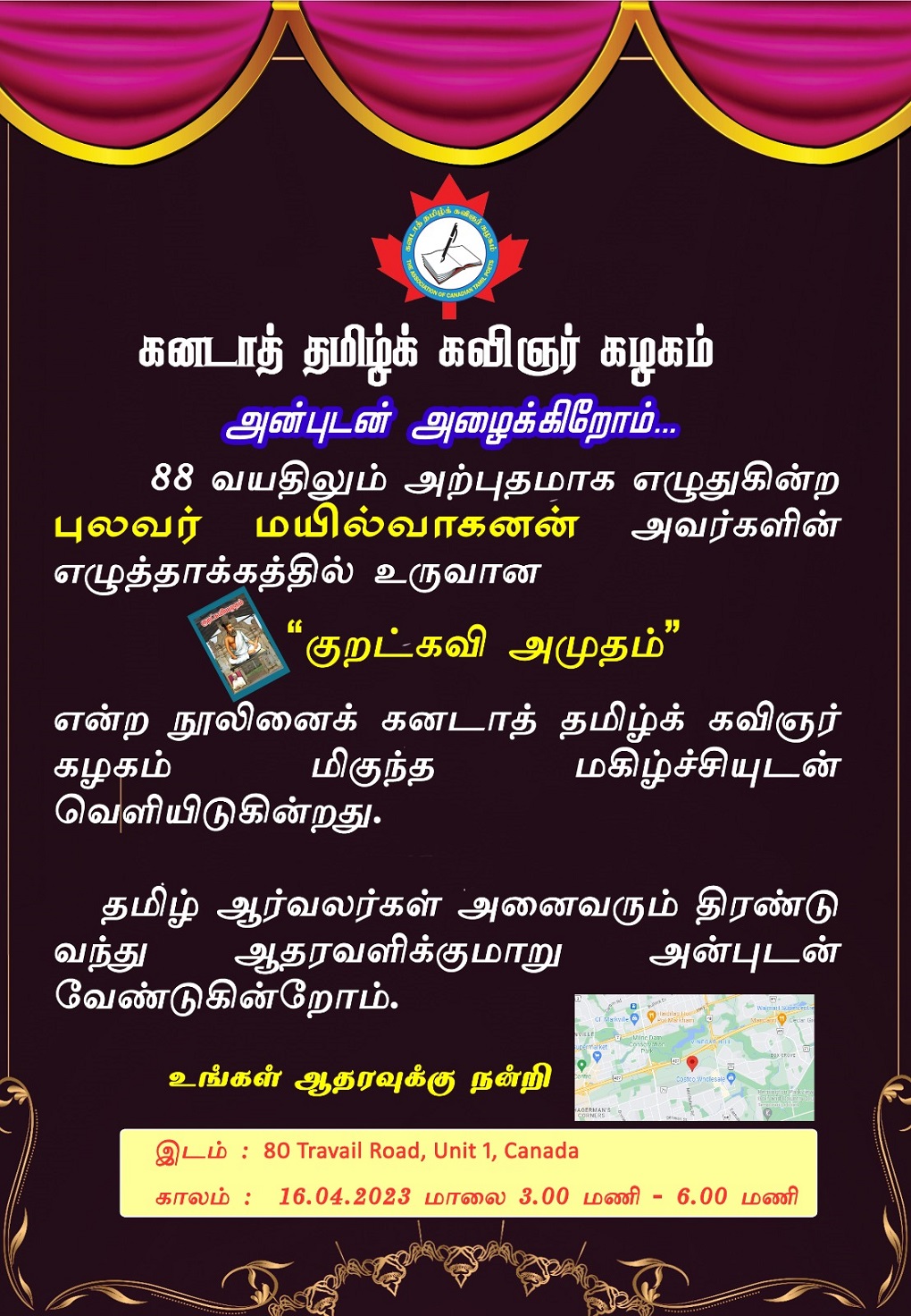 If you have an event you’d like us to post, a suggestion on how we can make our calendar better, or any other question, please email us at info(at)torontotamil.com. You can also complete our online event submission form. We look forward to hearing from you!