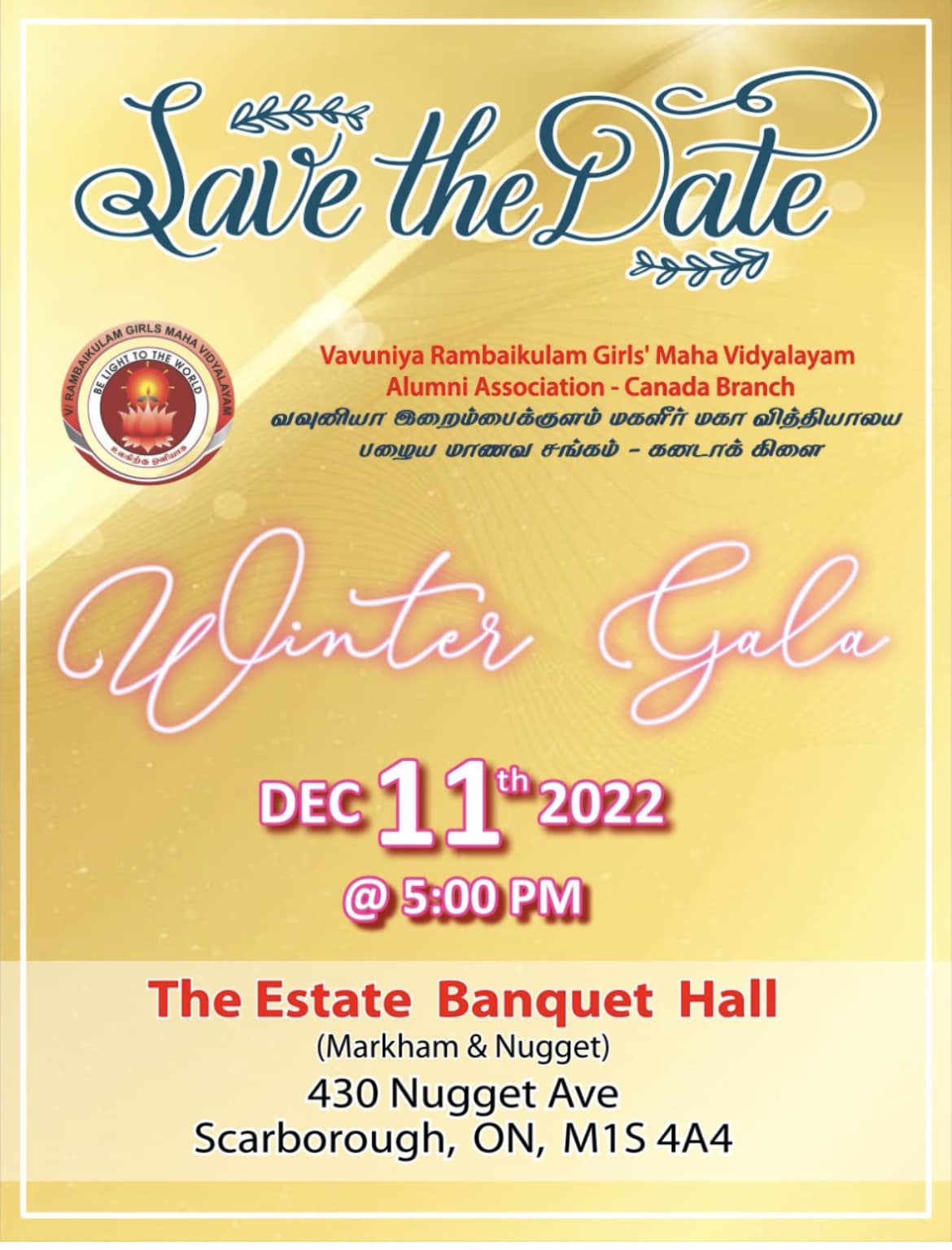 V/ Rambaikulam Girls Maha Vidhyalayam OSA Canada Winter Gala This announcement is for V/ Rambaikulam Girls Maha Vidhyalayam old students on behalf of the Canada Branch Committee Members. Please save the date for our school get-together. Mark your calendars and join us for a night of celebration with VRGMV students, |