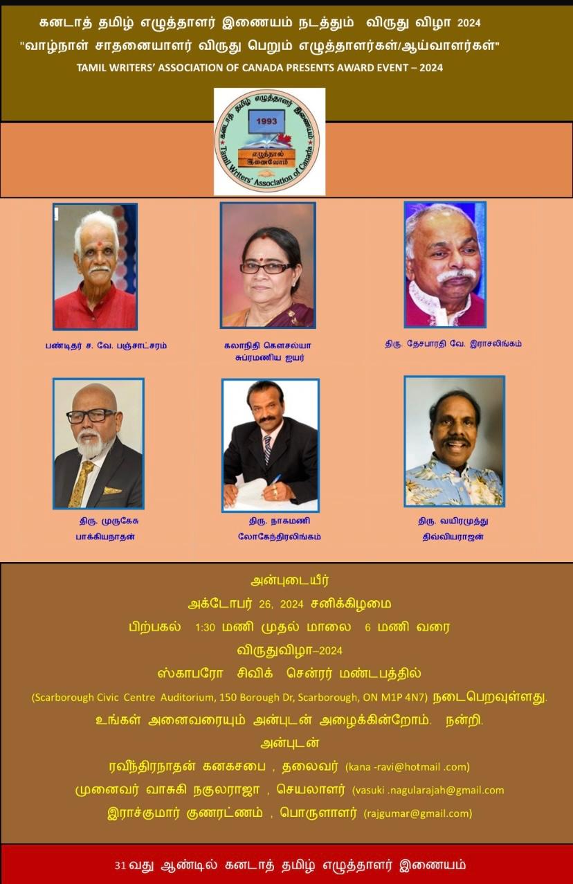 Scarborough Civic Centre 150 Borough Dr, Scarborough, ON, Canadaகனடாத் தமிழ் எழுத்தாளர் இணையம் - விருது விழா 2024