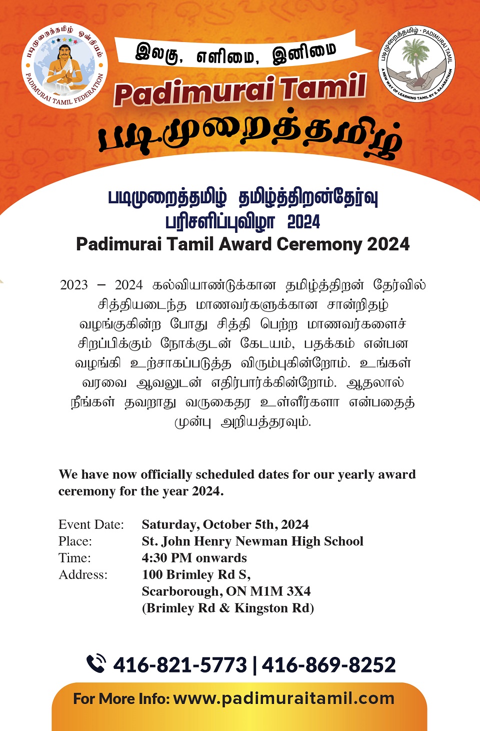 படிமுறைத்தமிழ் தமிழ்த்திறன்தேர்வு பரிசளிப்புவிழா 2024 2023 – 2024 கல்வியாண்டுக்கான தமிழ்த்திறன் தேர்வில் சித்தியடைந்த மாணவர்களுக்கான பரிசளிப்புவிழா 2024 yearly award ceremony for the year 2024. Event Date: Saturday, October 5th, 2024Place: St. John Henry Newman High SchoolTime: 4:30 PM onwardsAddress: 100 Brimley Rd S,Scarborough, ON M1M 3X4(Brimley Rd & Kingston Rd)