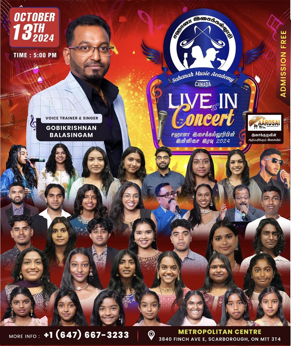 அனைத்து இசை ரசிகர்கட்கும் ஓர் அற்புதமான வாயப்பு எமது ஈழத்துக்கலை வாரிசுகளை மீண்டும் அறிமுகப்படுத்தும் இன்னிசை இரவு October 13 ம் திகதி அனைவரும் வந்து எங்கள் பிள்ளைகள் (உங்களது பிள்ளைகளின்) திறமைகளை பார்த்து பாராட்டிச்செல்ல அனைவரையும் அன்போடு அழைக்கின்றோம்.