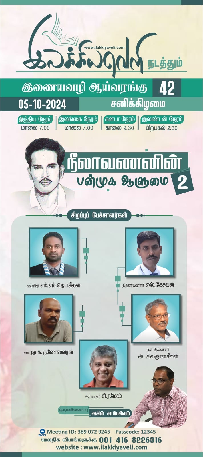 நீலாவணனின் பன்முக ஆளுமை - 2 நாள்: சனிக்கிழமை 05-10-2024 நேரம்: இந்திய நேரம் - மாலை 7.00இலங்கை நேரம் - மாலை 7.00கனடா நேரம் - காலை 9.30இலண்டன் நேரம் - பிற்பகல் 2:30 வழி: ZOOM Join Zoom Meeting: Meeting ID: 389 072 9245 Passcode: 12345 https://us02web.zoom.us/j/3890729245?pwd=a1ZERVVXY1VBZjV3SnVCUEh1bEVUZz09 ஒருங்கிணைப்பு: அகில் சாம்பசிவம் சிறப்புப் பேச்சாளர்கள்: கலாநிதி எம்.எம்.ஜெயசீலன்திறனாய்வாளர் எஸ்.கேசவன்கலாநிதி சு.குணேஸ்வரன்கள ஆய்வாளர் அ.