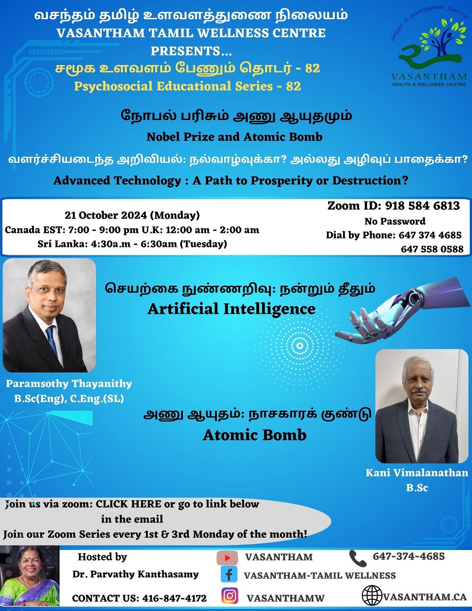 “மருத்துவ பரிசோதனைகள்; எவை? எப்போது? ஏன்?” சிறப்புப் பேச்சாளர்: வைத்திய கலாநிதி அருணா லம்போதரன் ஐயந்தெளிதல் அரங்கு: நாள்: 19-10-2024 (சனிக்கிழமை)நேரம்: மாலை 3:00 முதல் 7:00 வரைஇடம்: ரொறன்ரோ தமிழ்ச்சங்க மண்டபம்Unit 7, 5633, Finch avenue East,Scarborough,M1B 5k9(Legacy Medical Centre) தொடர்புகளுக்கு: அகில் - 416-822-6316 அனைவரையும் அன்புடன் அழைக்கிறோம்