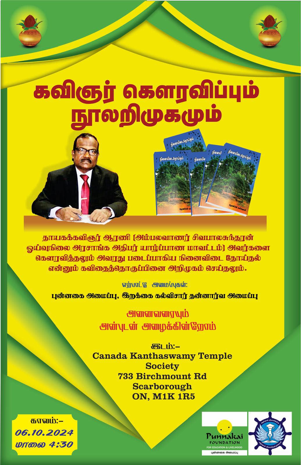 தாயக கவிஞர் ஆரணி எனும் புனைப்பெயருடைய இளைப்பாறிய யாழ் அரசாங்க அதிபரும் வட மாகாணசபையின் விவசாய அமைச்சு, பொதுச்சேவை ஆணைக்குளு ஆகியவற்றின் செயலாளராகவும் பிரதிப்பிரதம செயலாளராகவும் கடமை ஆற்றியதுடன் அரச கருமமொழிகள் ஆணைக்குழுவின் உறுப்பினராகவும் கடமையாற்றும் மதிப்புக்குரிய அ. சிவபாலசுந்தரன் அவர்களின் கௌரவிப்பும் நூலறிமுகநிகழ்வும் கனடா கந்தசுவாமி கோவில் மண்டபத்தில் நடாத்த ஏற்பாடு செய்யப்பட்டுள்ளது அந்நிகழ்வினை சிறப்புடன் நடாத்த தங்கள் அனைவரினது ஒத்துழைப்புக்களை மனதார எதிர்பார்க்கின்றோம் நன்றி