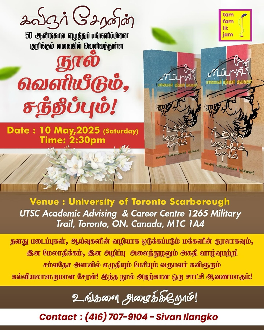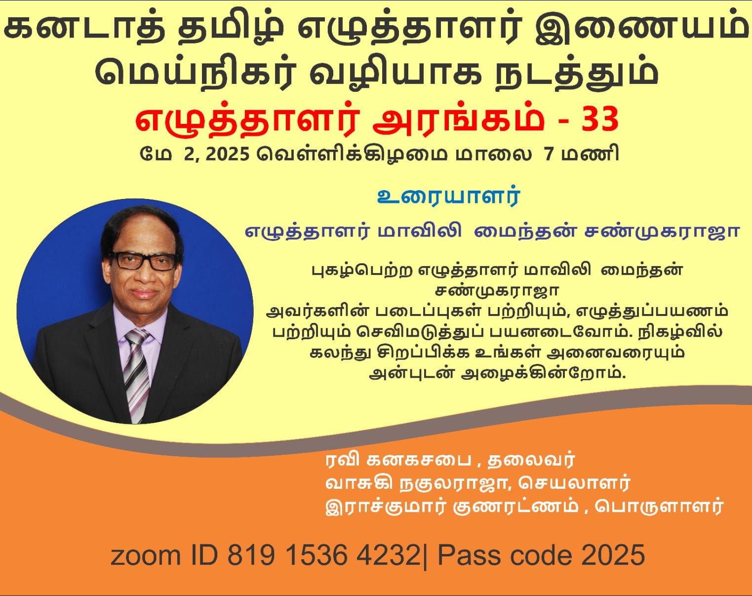 Tamil Writers' Association of Canada is inviting you to a scheduled Zoom meeting. Topic: Writer's StageTime: May 2, 2025 07:00 PM Eastern Time (US and Canada) Join Zoom Meetinghttps://us02web.zoom.us/j/81915364232... Meeting ID: 819 1536 4232Passcode: 2025