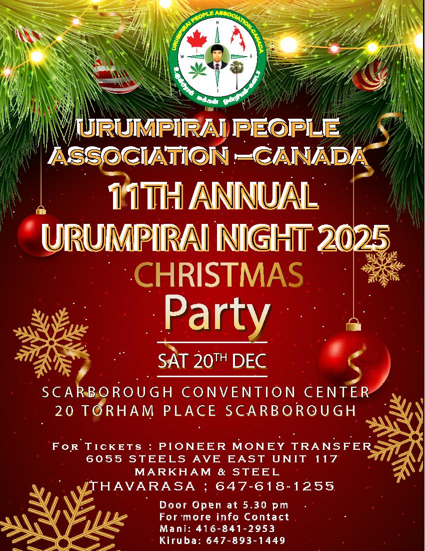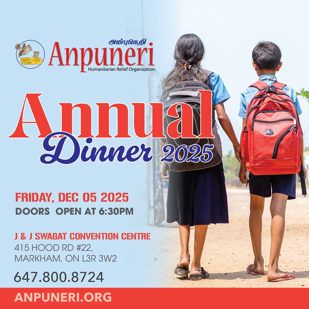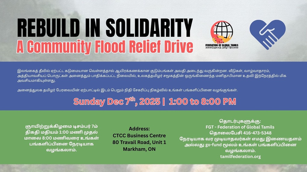 Please join us on Sunday, December 7th, anytime between 1 and 8 PM to learn more about the Federation of Global Tamils’ Flood Relief Drive. You can also donate to our drive in person or via our GoFundMe link https://gofund.me/29c47503b All proceeds will go directly toward essential flood-relief efforts.