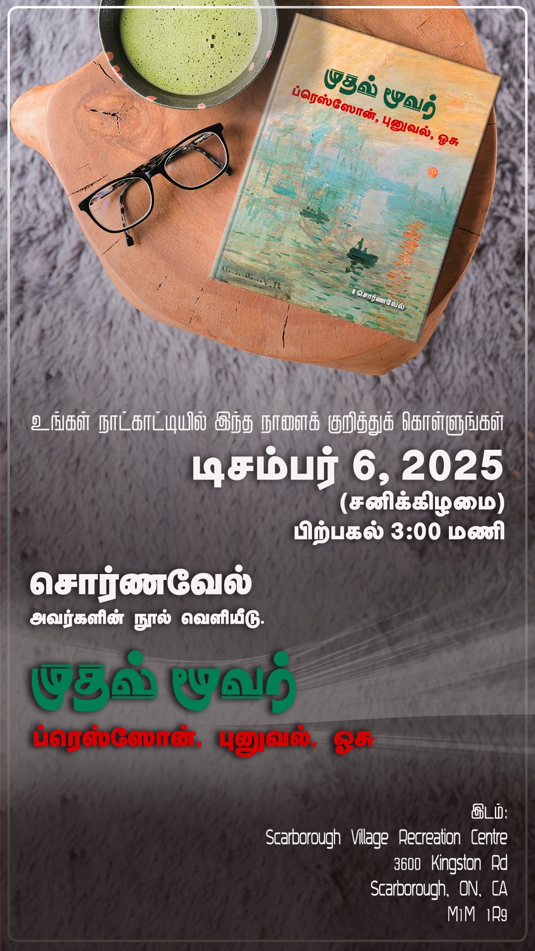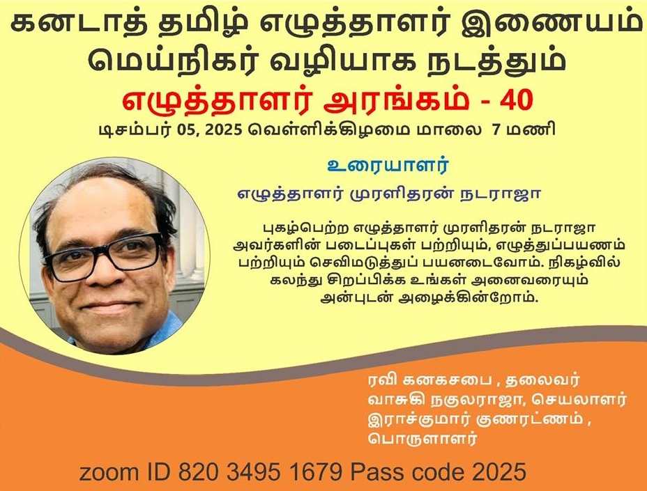 Tamil Writers' Association of Canada is inviting you to a scheduled Zoom meeting. Topic: Writer's Stage 41 Time: Jan 2, 2026 07:00 PM Eastern Time (US and Canada) Join Zoom Meeting https://us02web.zoom.us/j/81872361686 Meeting ID: 818 7236 1686 Passcode: 2026