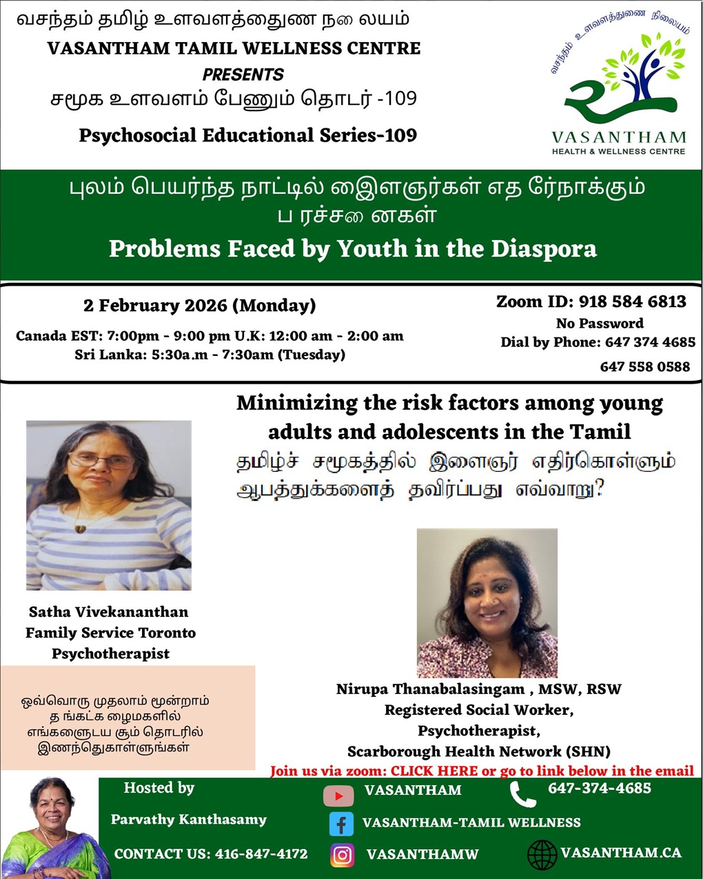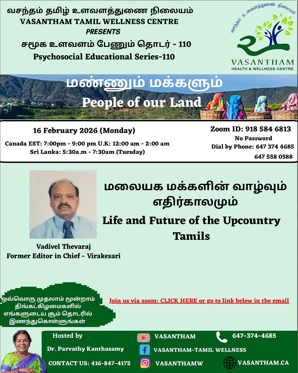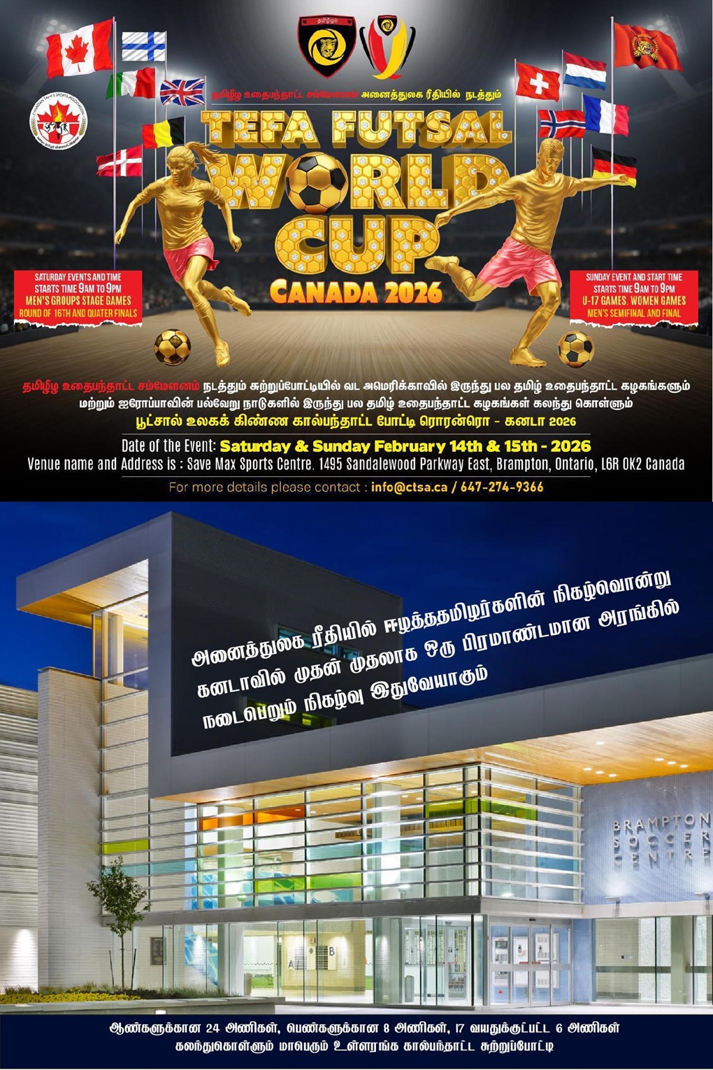 Tamil Writers’ Association of Canada is inviting you to a scheduled Zoom meeting. Topic: Writer’s Stage 42 Time: Feb 6, 2026 07:00 PM Eastern Time (US and Canada) Join Zoom Meeting https://us02web.zoom.us/j/82656784535 Meeting ID: 826 5678 4535 Passcode: 2026 |
