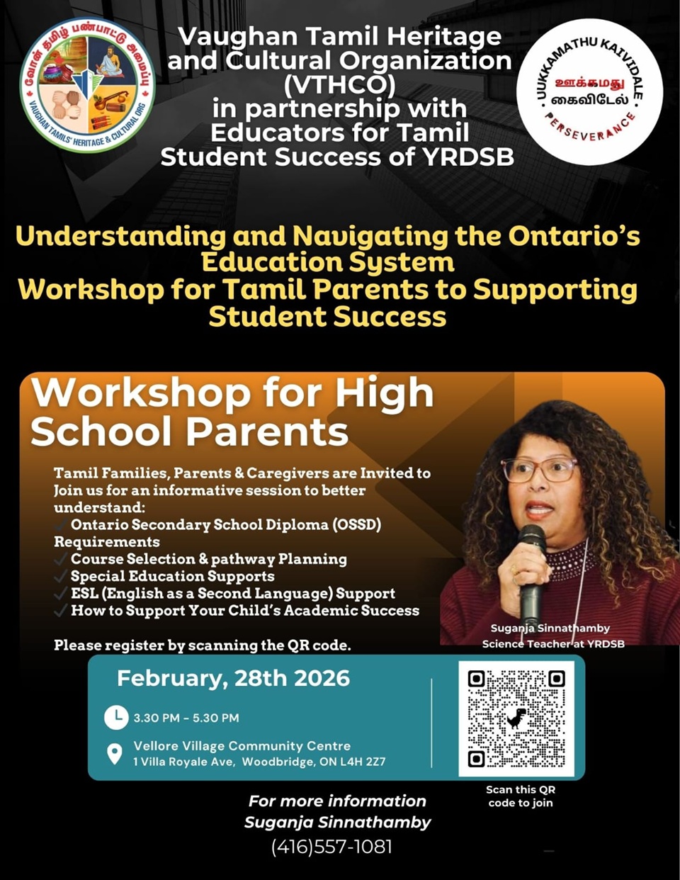 Vaughan Tamils' Heritage and Cultural Organization is pleased to host a seminar to support high school students and parents with course selection and career pathway planning.🗓 Date: Saturday, February 28, 2026⏰ Time: 3:30 PM – 5:30 PM📍 Venue: Cafetorium, Vellore Village Community Centre 1 Villa Royale Ave, Woodbridge, ON L4H |