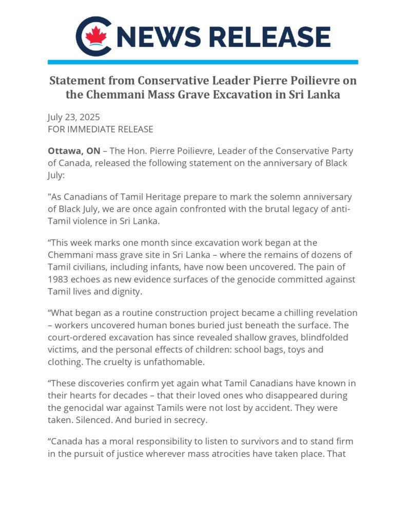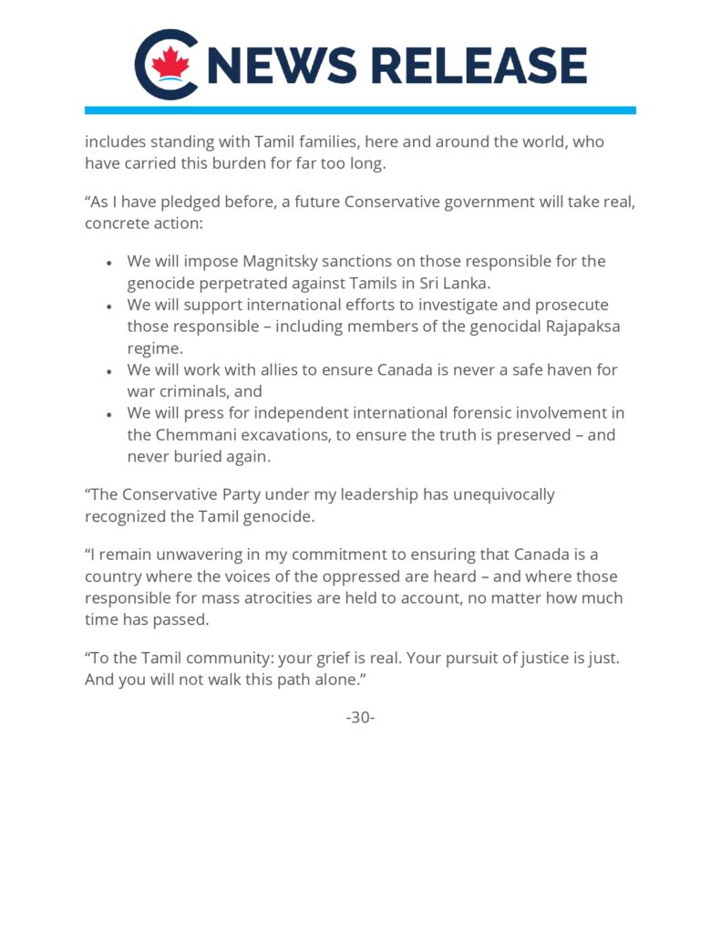 - செம்மணி அகழ்வாராய்ச்சிகளில் சுயாதீனமான சர்வதேச தடயவியல் ஈடுபாட்டிற்கு அழுத்தம் கொடுப்போம், உண்மை பாதுகாக்கப்படுவதை உறுதிசெய்வோம் – மீண்டும் ஒருபோதும் புதைக்கப்படக்கூடாது. “எனது தலைமையின் கீழ் உள்ள கன்சர்வேடிவ் கட்சி தமிழ் இனப்படுகொலையை சந்தேகத்திற்கு இடமின்றி அங்கீகரித்துள்ளது.