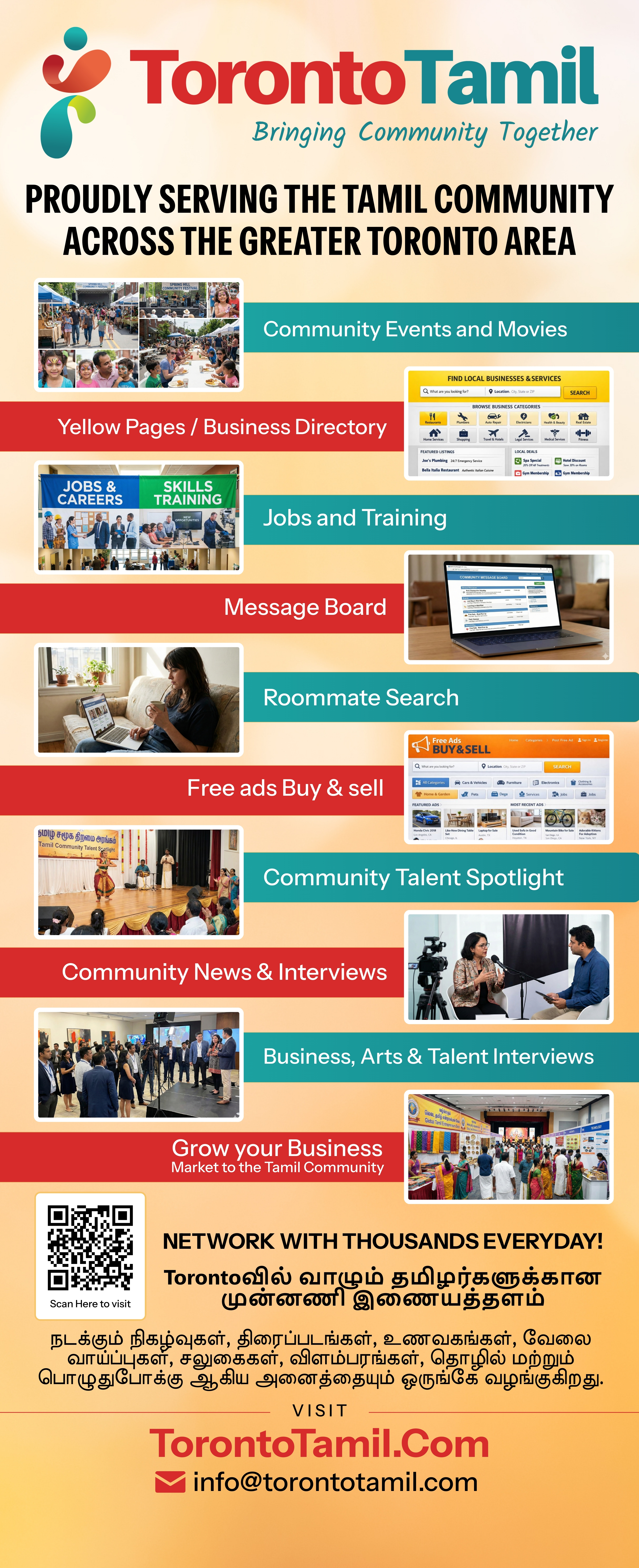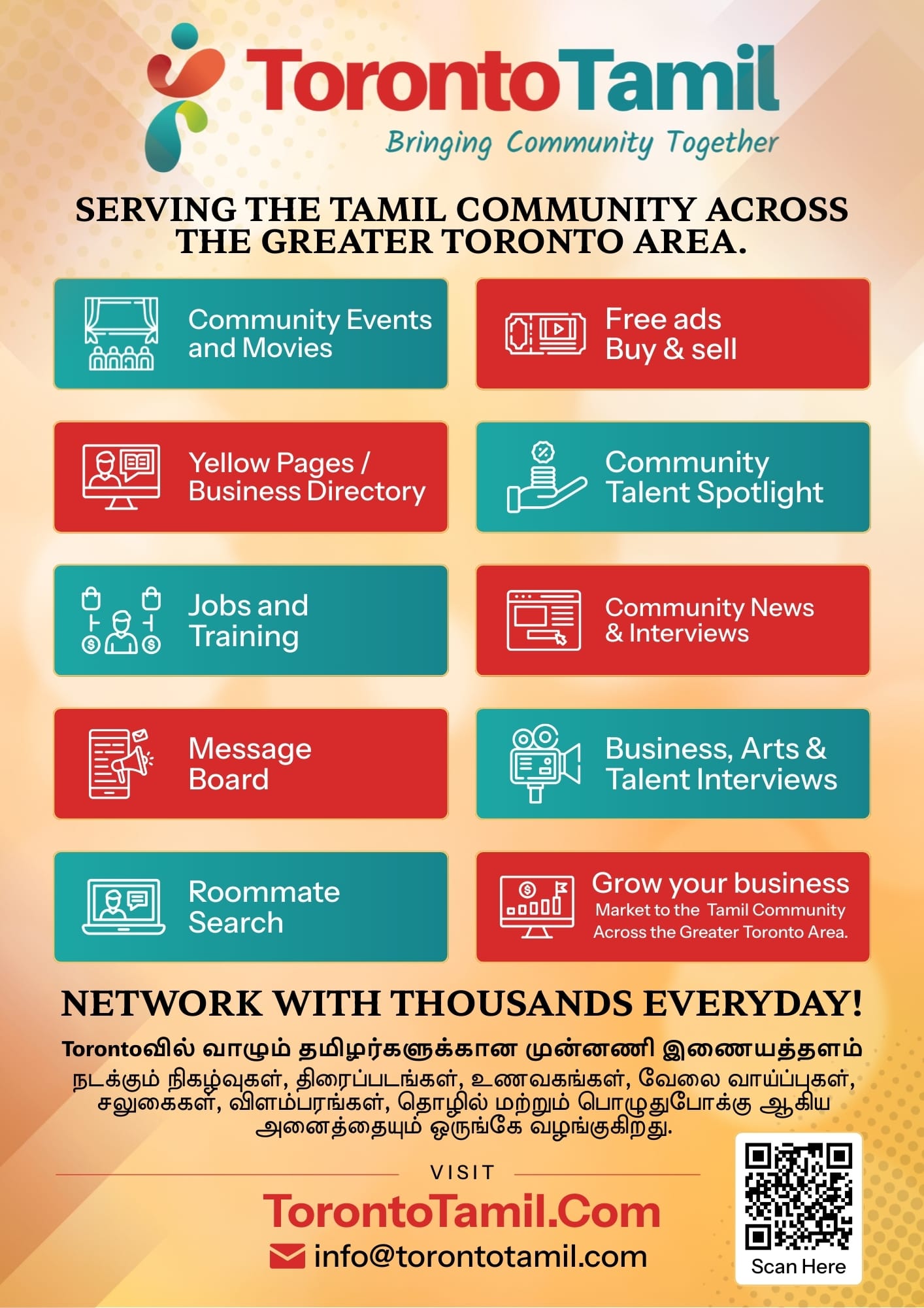 You are welcome to list TorontoTamil as a sponsor of your event and use the TorontoTamil logo in your event’s promotional materials (website, social media, programs, posters, step and repeat, etc).